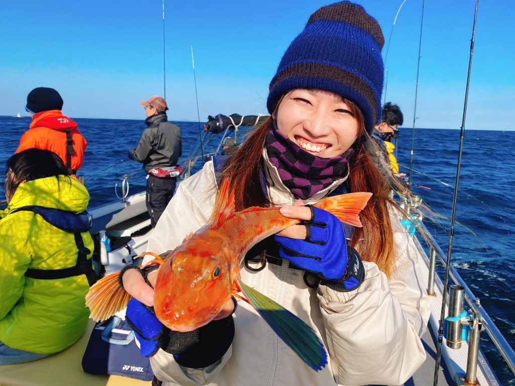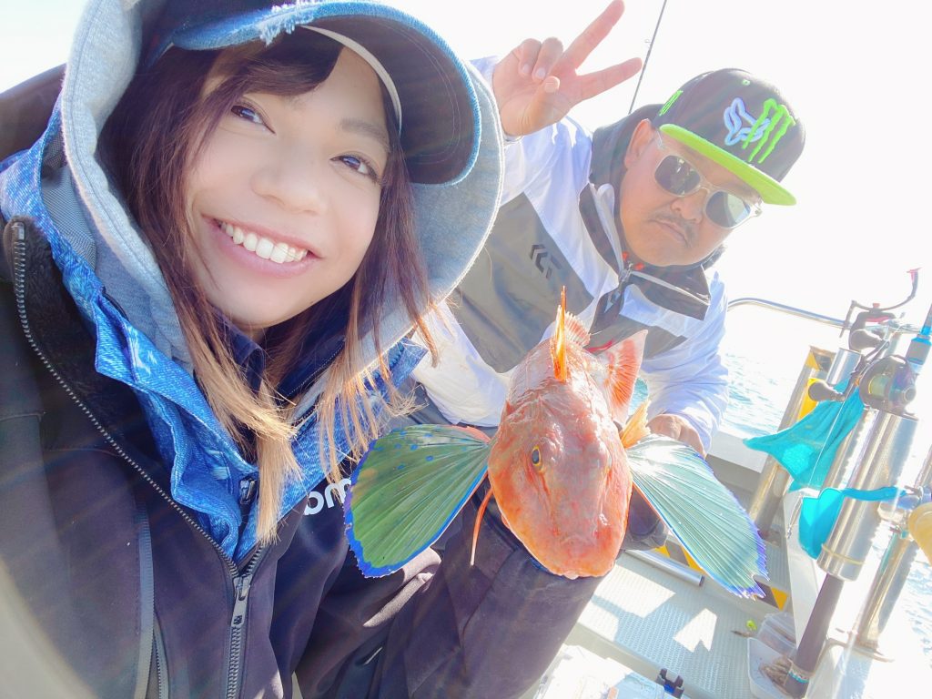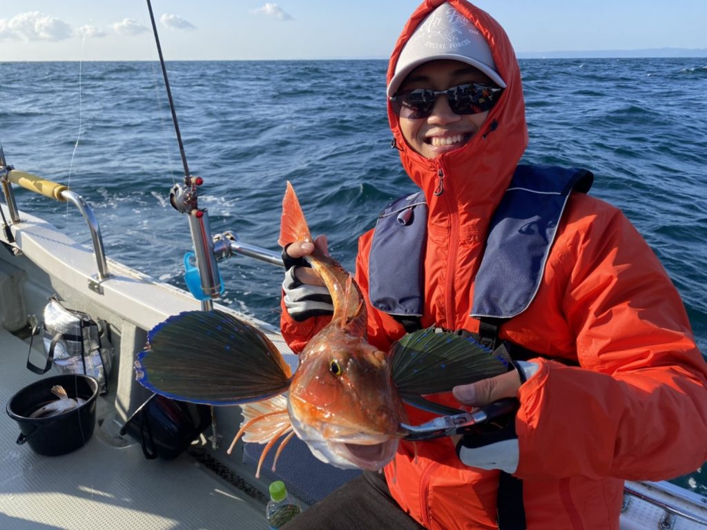 こちらは人生初の船釣りで、ファーストフィッシュはホウボウ!そして飛行機持ち!