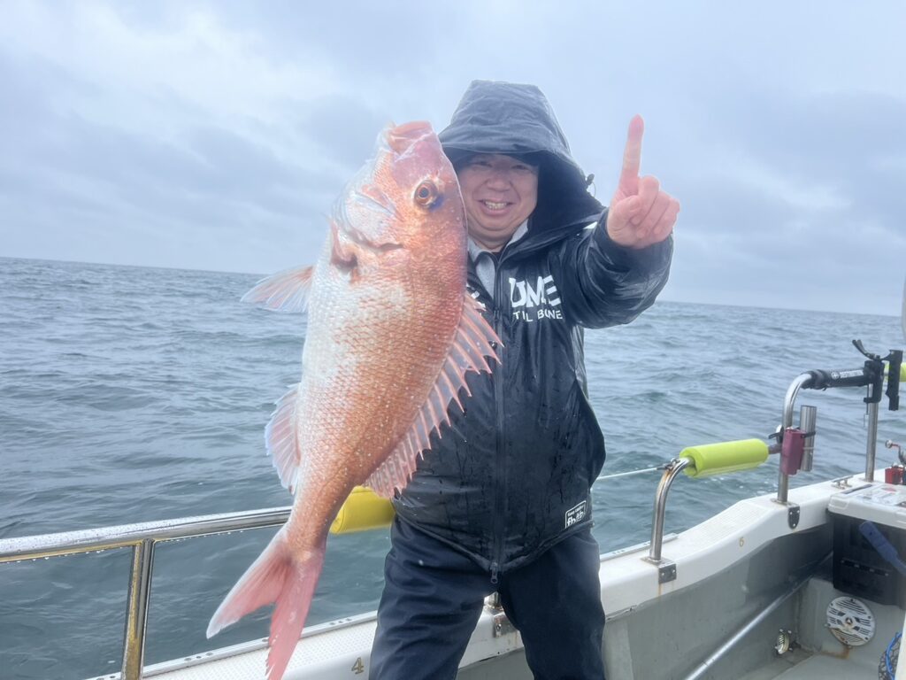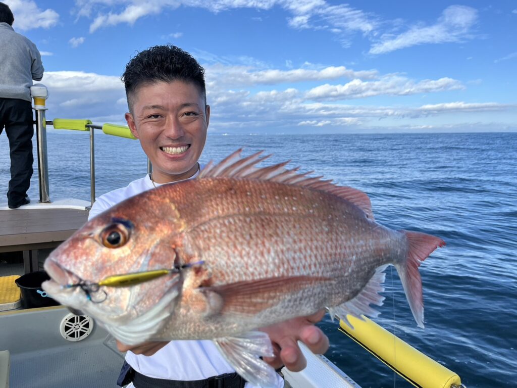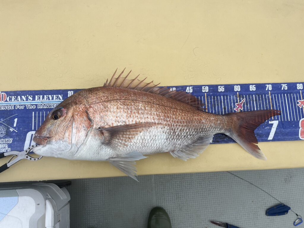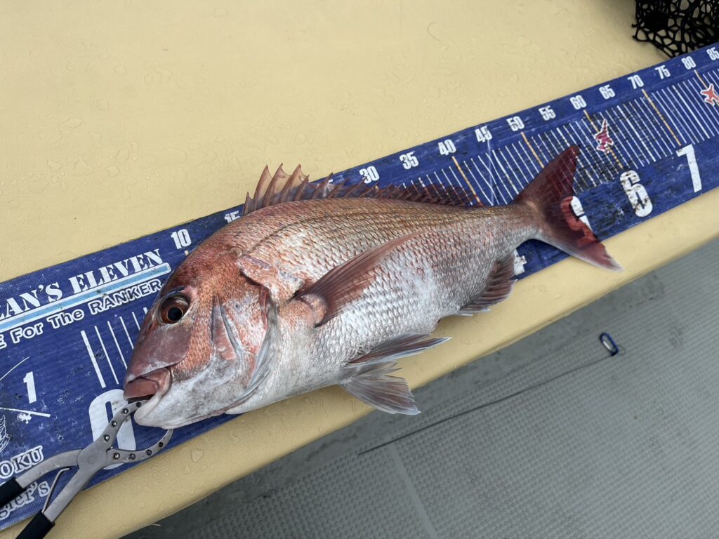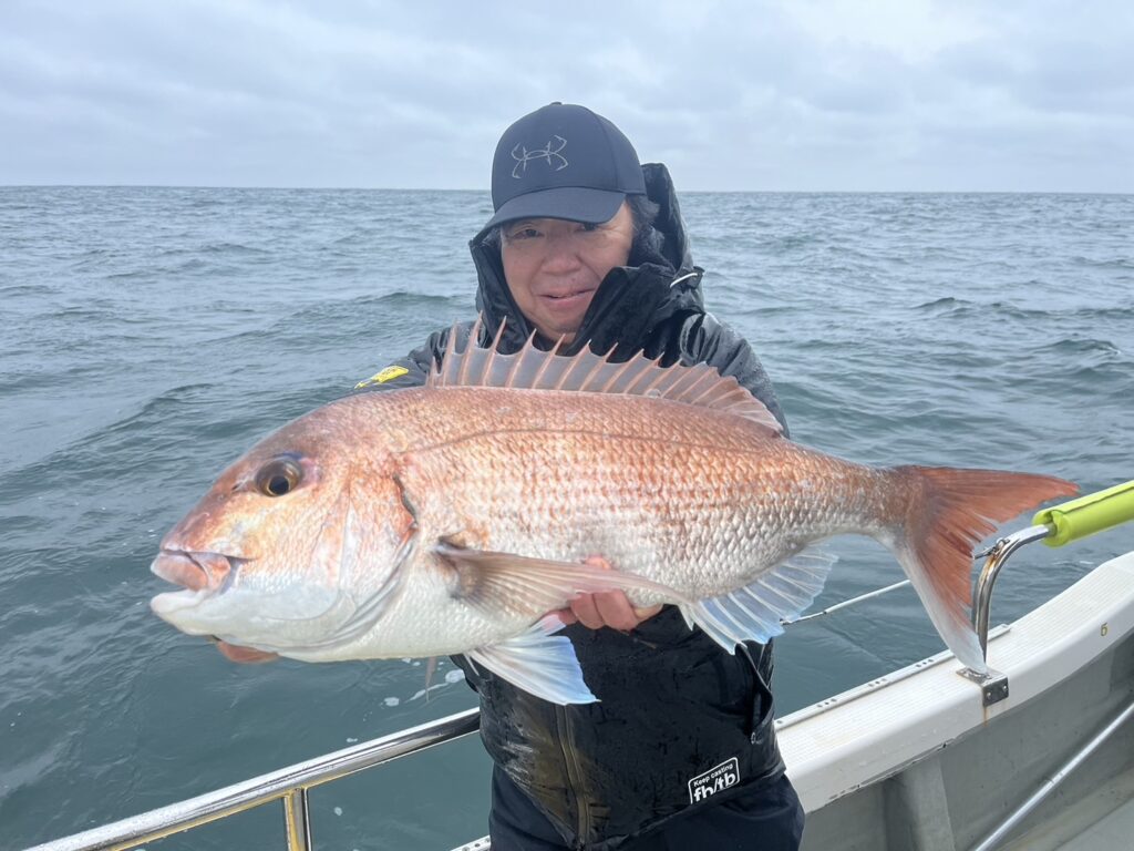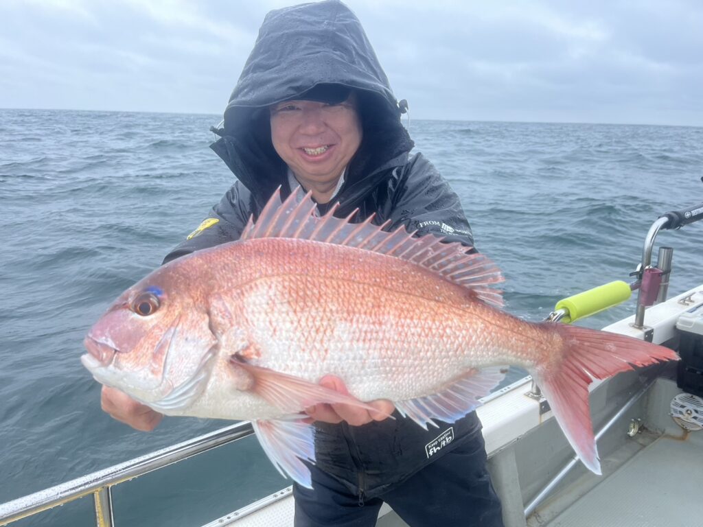 午後から風予報もあり限られたエリアでの釣行でしたが、開始1投目でいきなり良型真鯛をキャッチ!