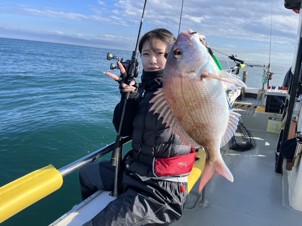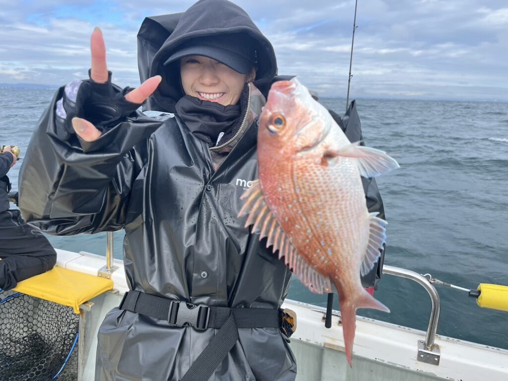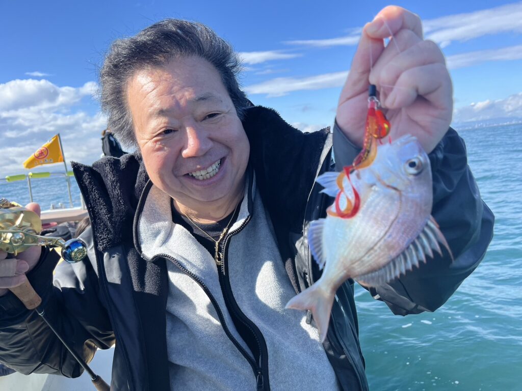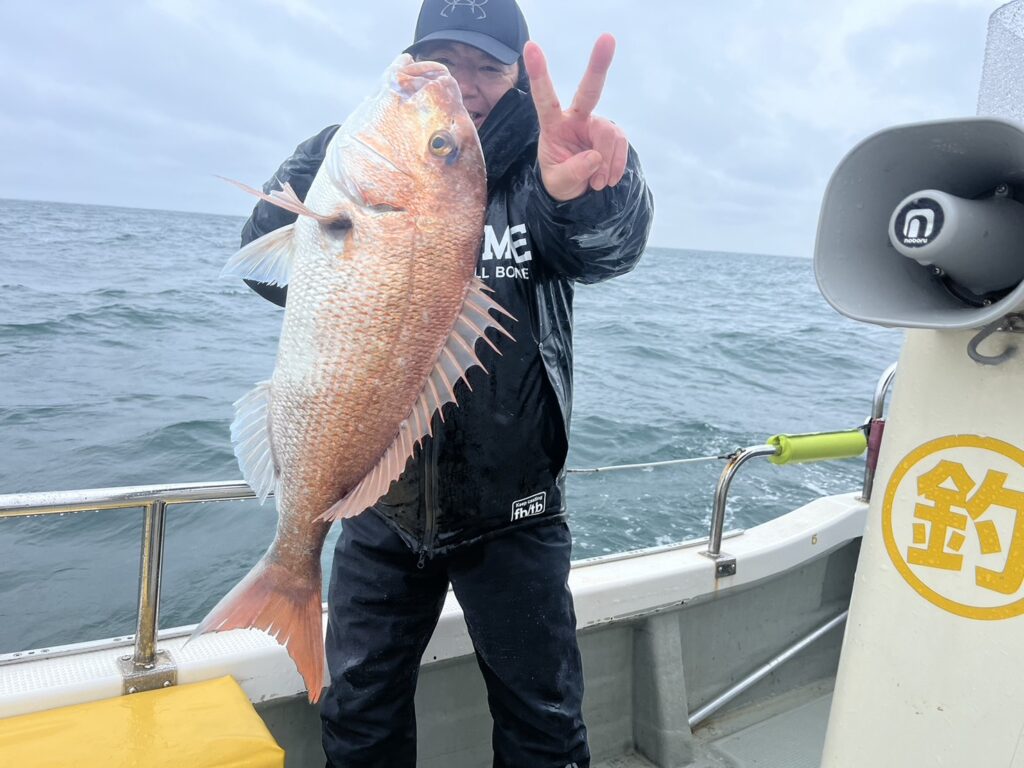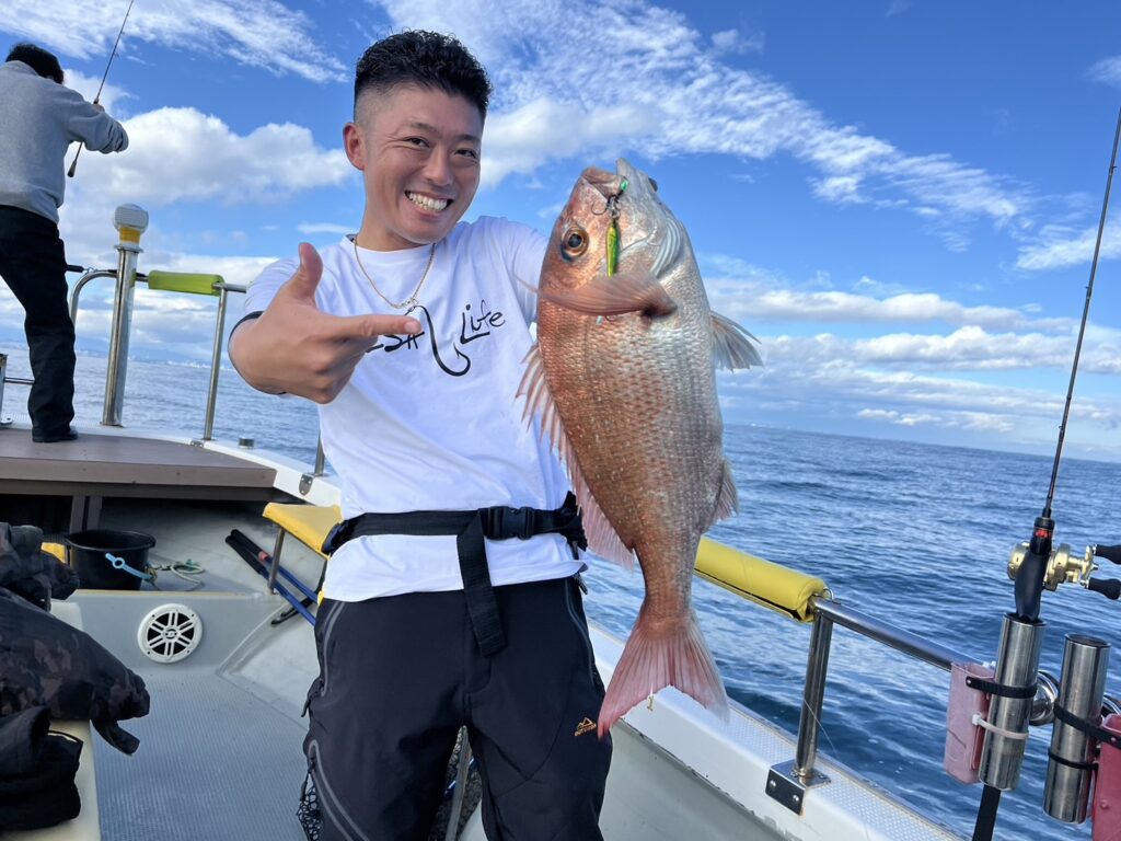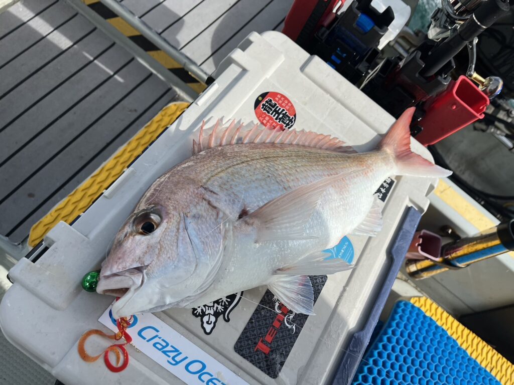 午後から風予報もあり限られたエリアでの釣行でしたが、開始1投目でいきなり良型真鯛をキャッチ!