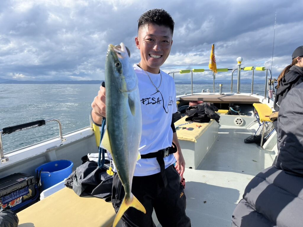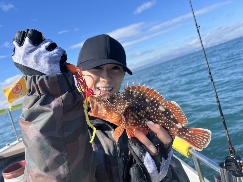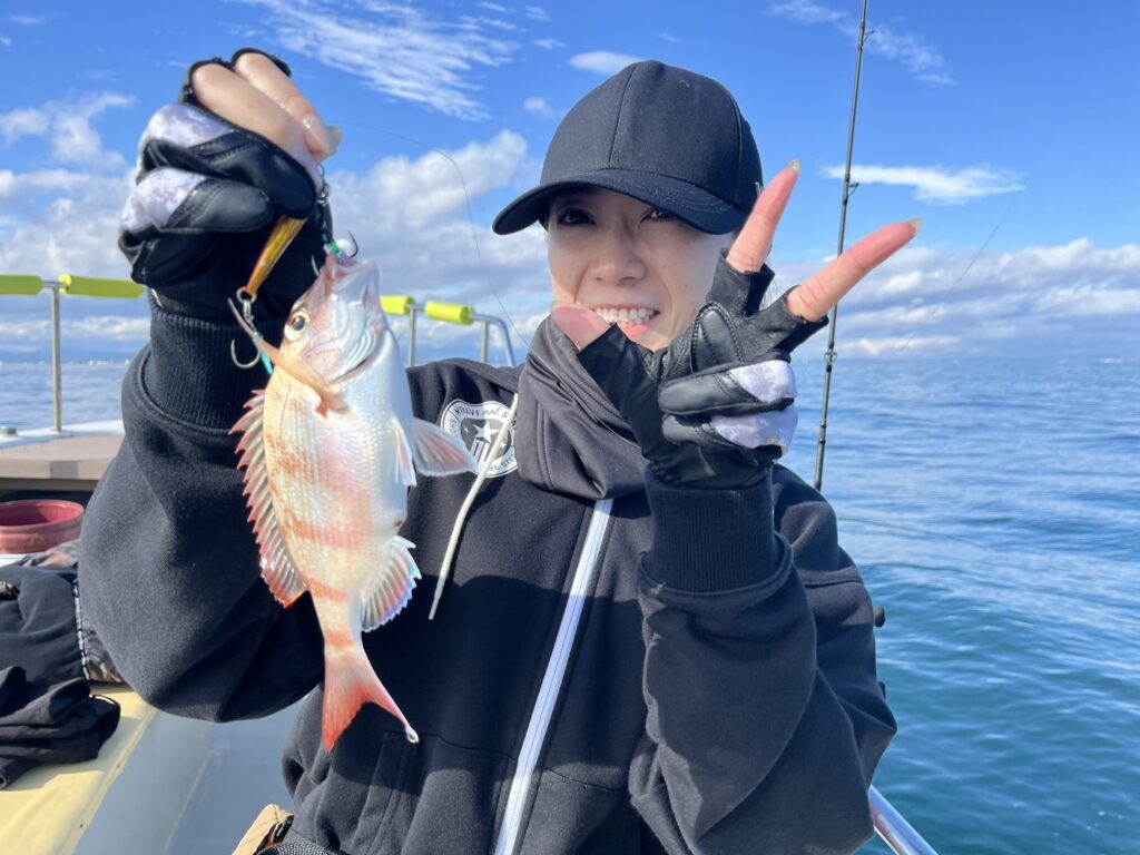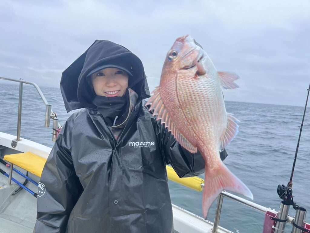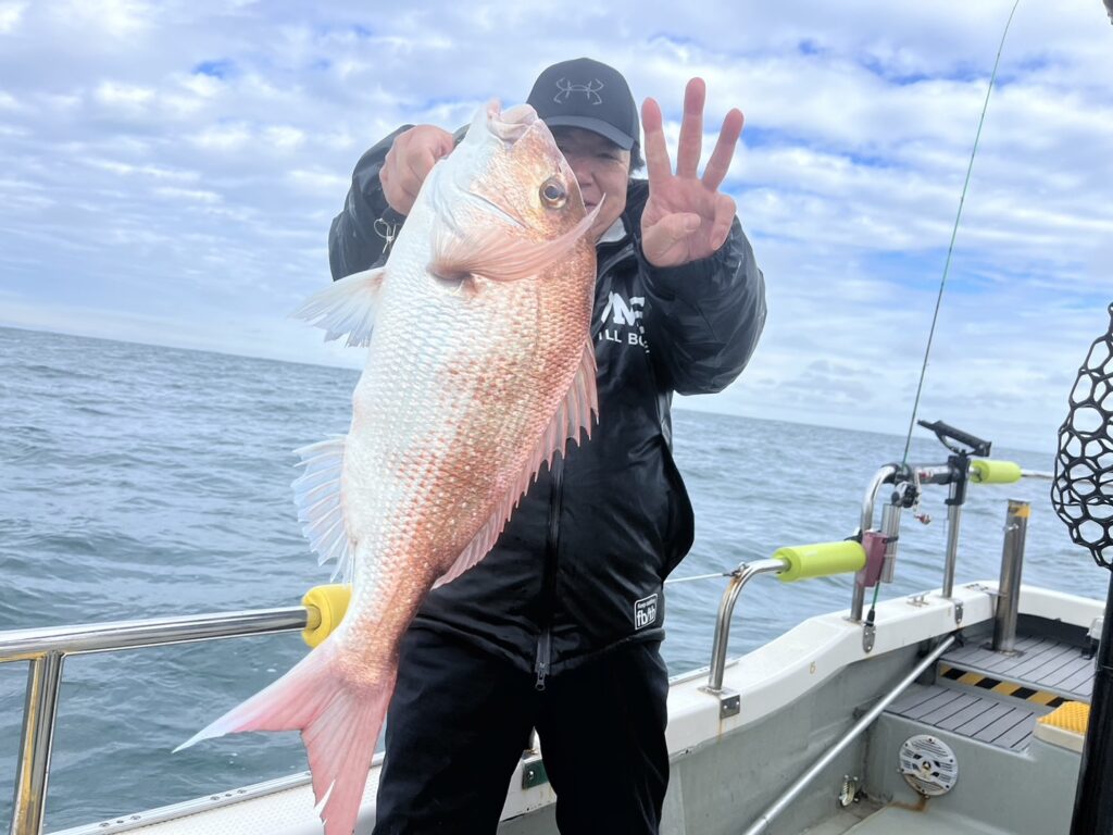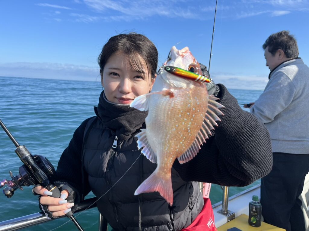 午後から風予報もあり限られたエリアでの釣行でしたが、開始1投目でいきなり良型真鯛をキャッチ!