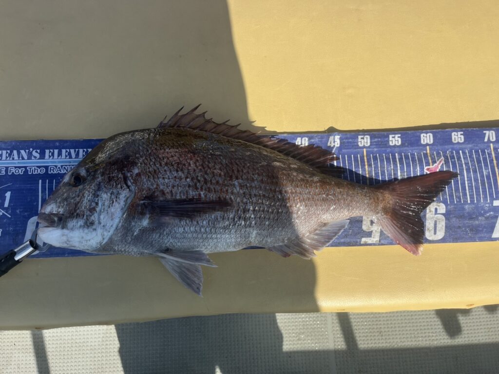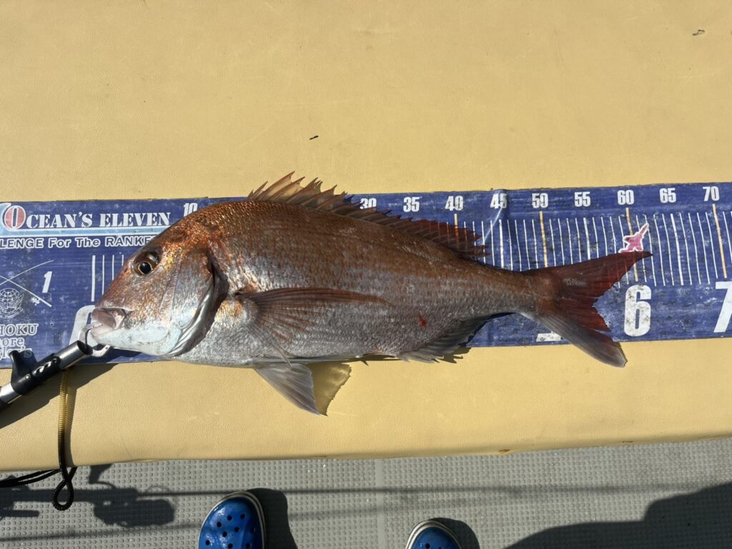 今日はファーストポイントから終了まで終始釣れ続けて、本命真鯛は64cmを筆頭に15枚!