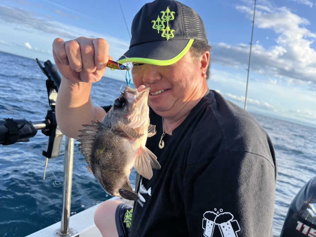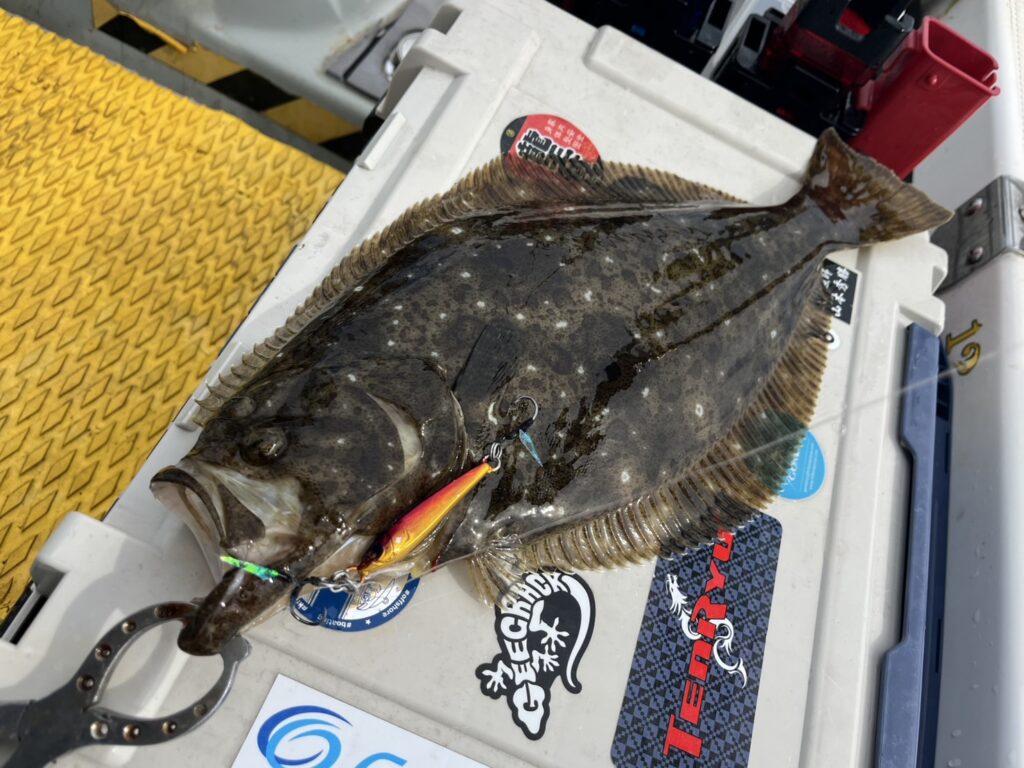それでも行ける範囲内で真鯛を狙いながらヒラメやホウボウを拾いながら結局沖には行けず、夕マズメまでしましたがタイムアップ‥‥。