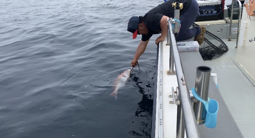 朝のうちは潮も動かず厳しいかな…って思っていたら、ファーストポイントでいきなり72cmの雄のマダイをゲット!