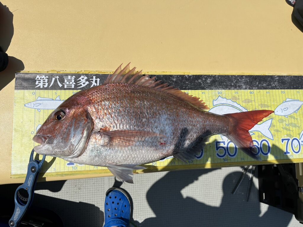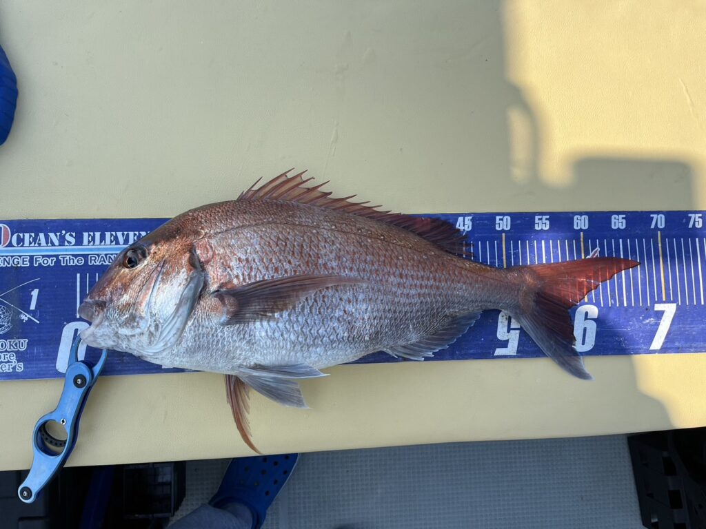 やはり6時出船と言う事で朝マズメには間に合わず、終了のお昼過ぎまでは拾い釣りの展開でしたが、青物の活性は高くその中に真鯛も交じる感じの釣行となり本命真鯛は67cmを筆頭に12枚キャッチ!