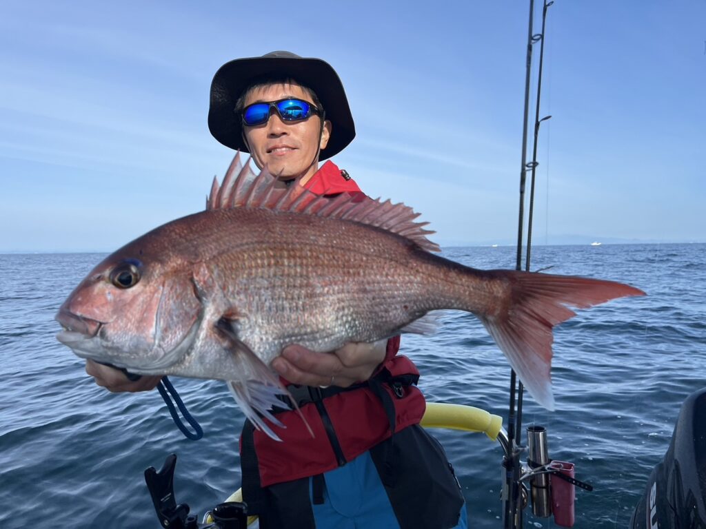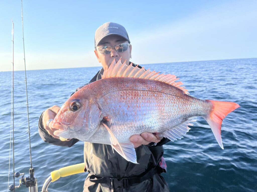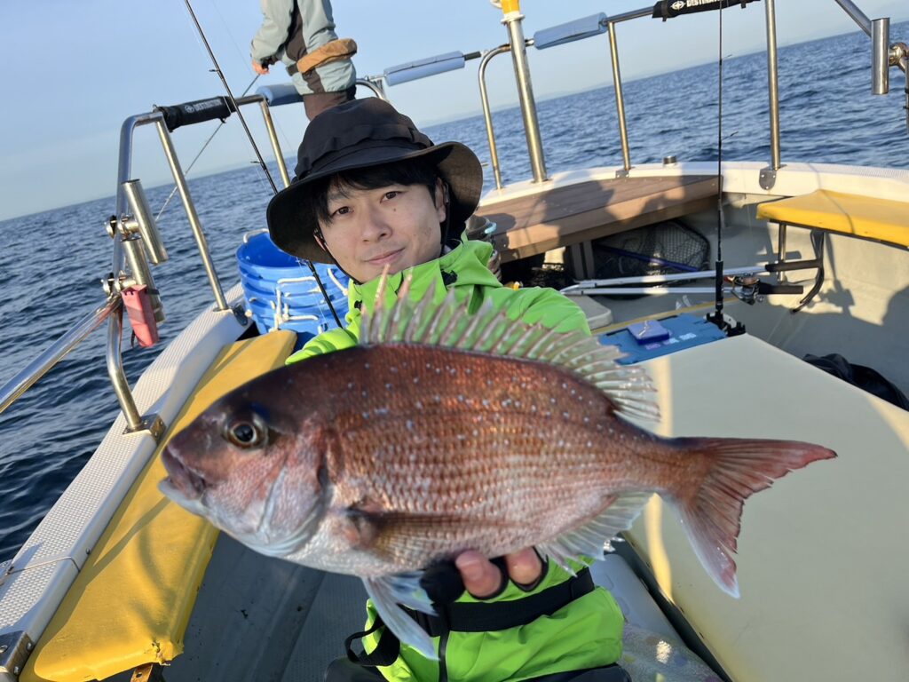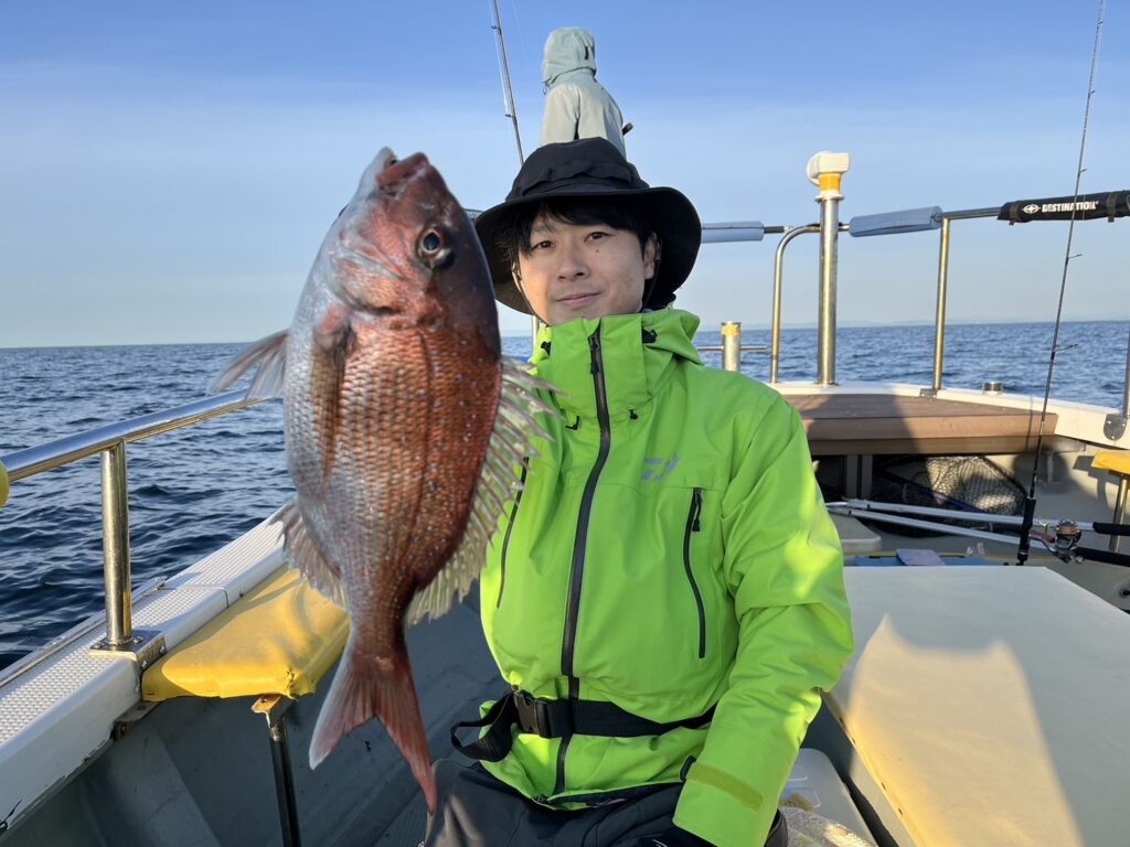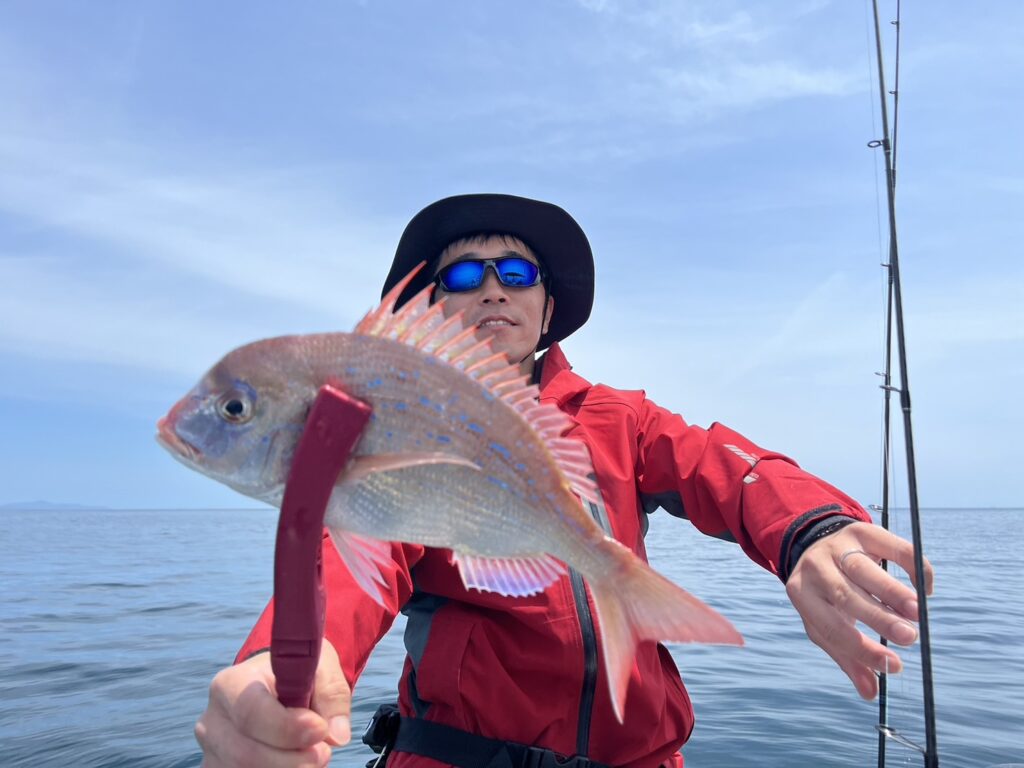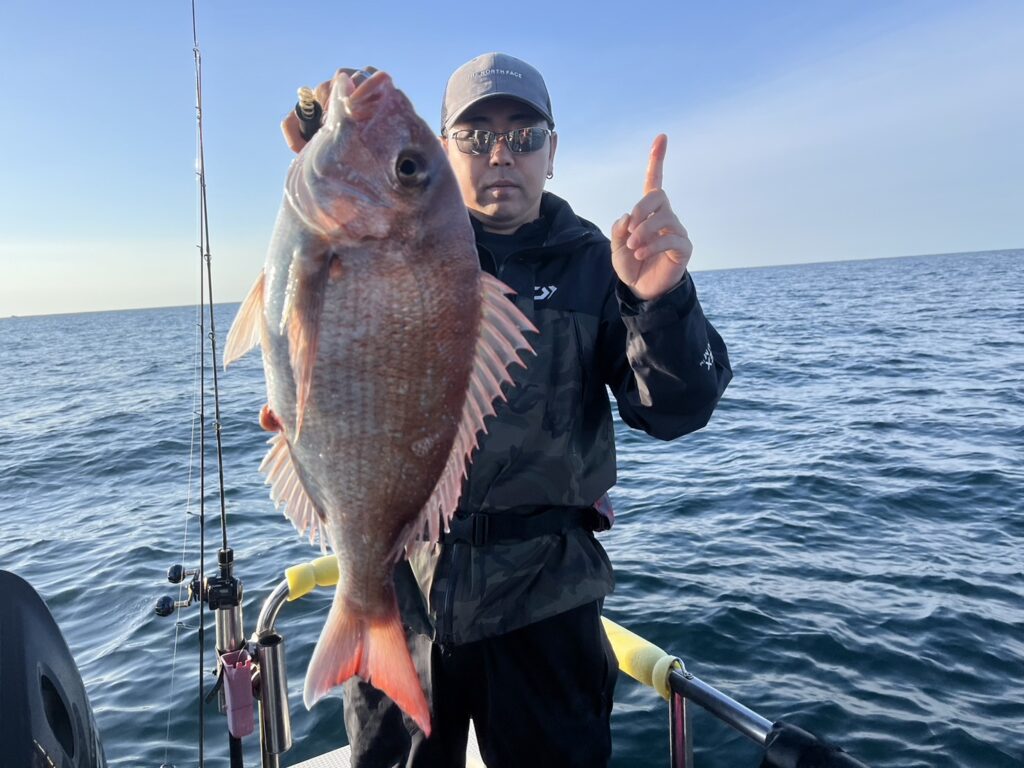 ファーストポイントに着いて1投目でいきなり本命真鯛をキャッチ!