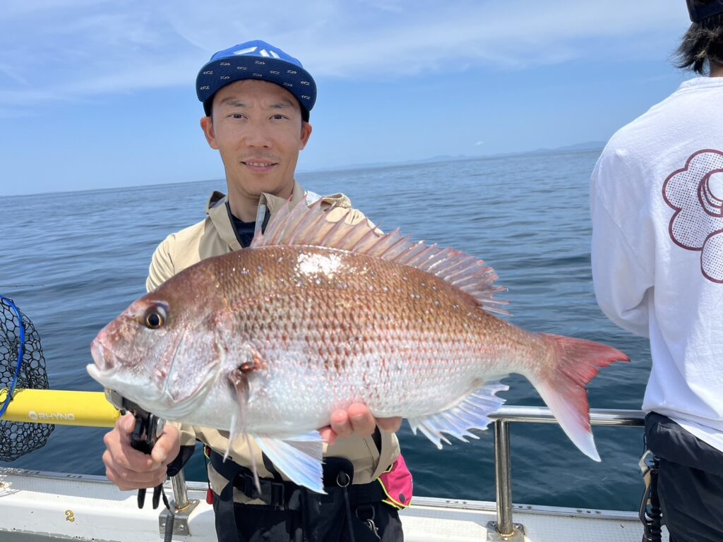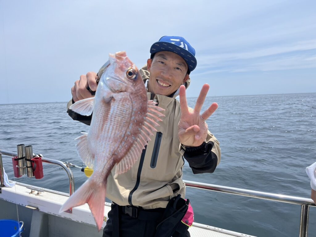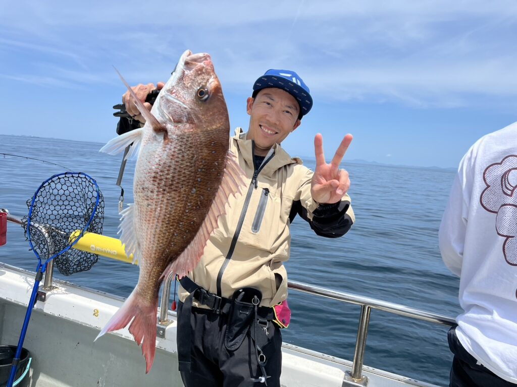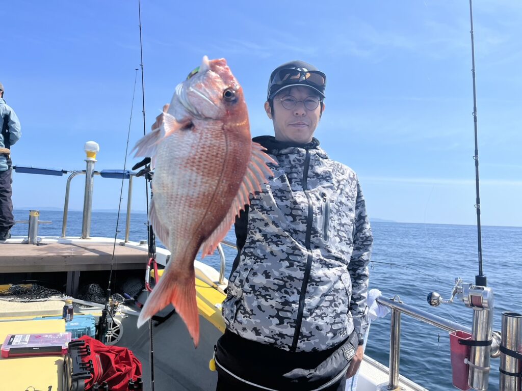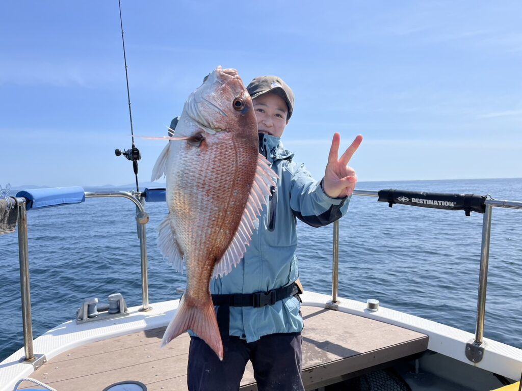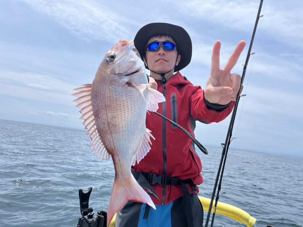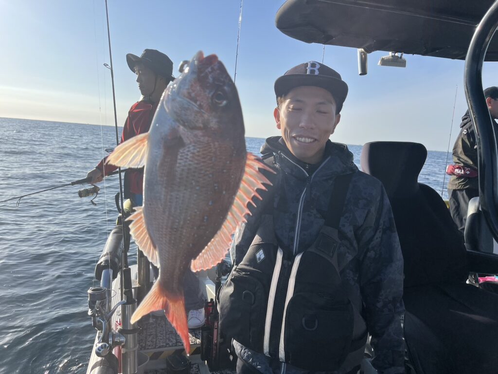 ファーストポイントに着いて1投目でいきなり本命真鯛をキャッチ!