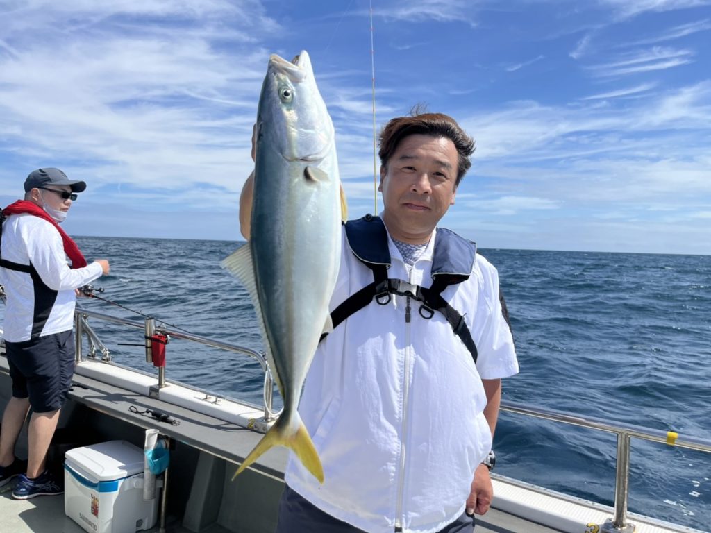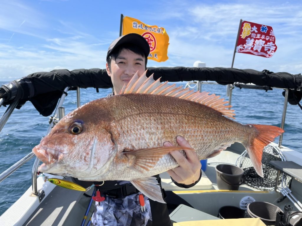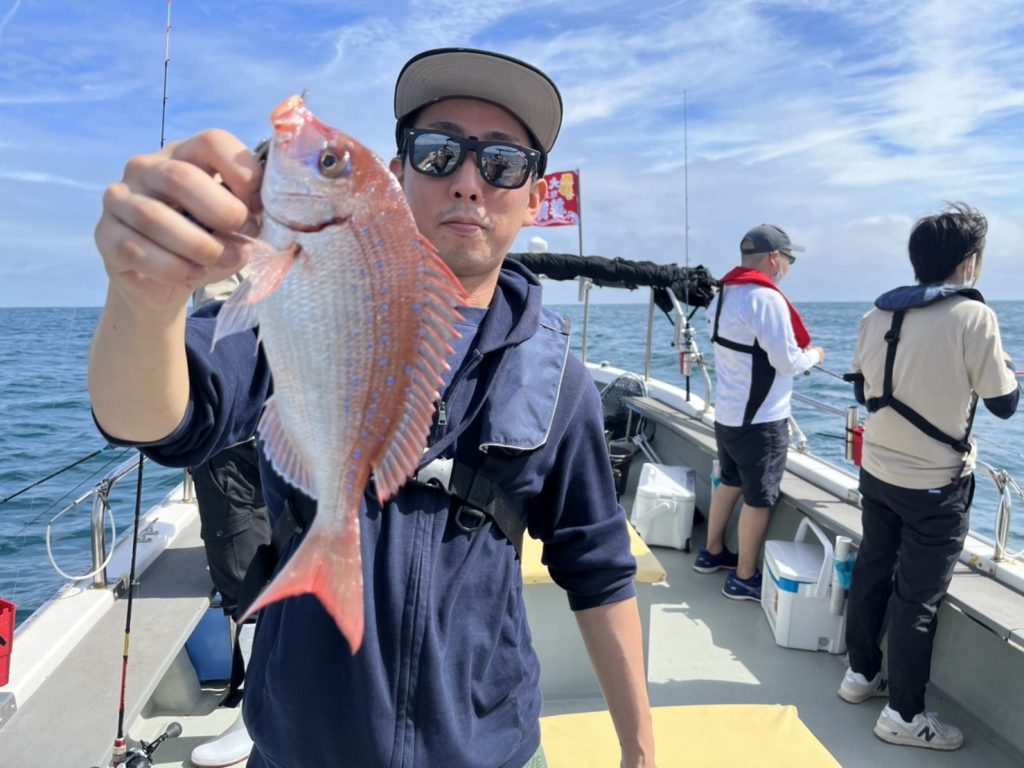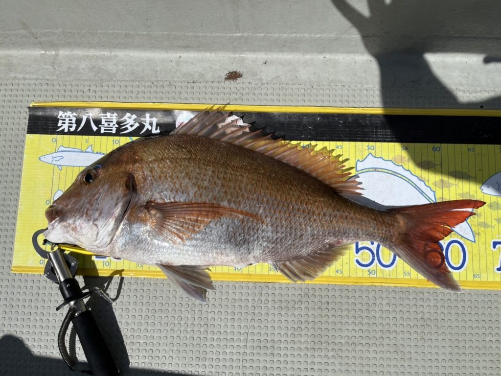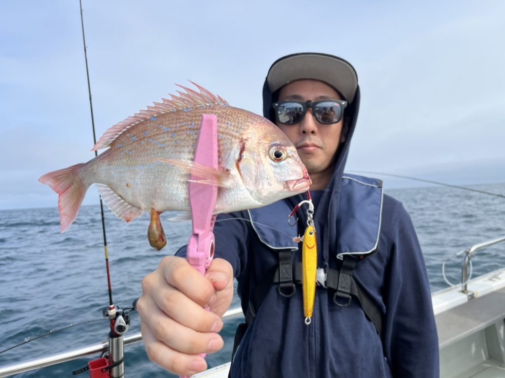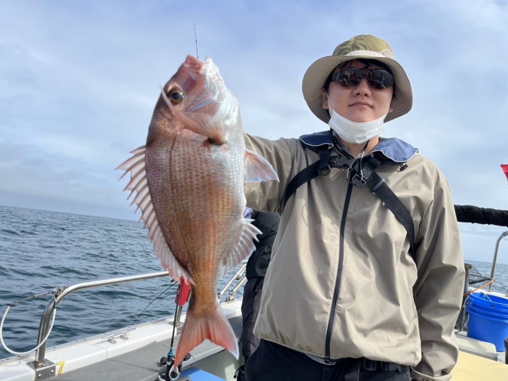 その後も飽きない程度にゲスト達が釣れるもなかなかマダイに届かず、昼過ぎの潮が動いたタイミングで大鯛キャッチ!