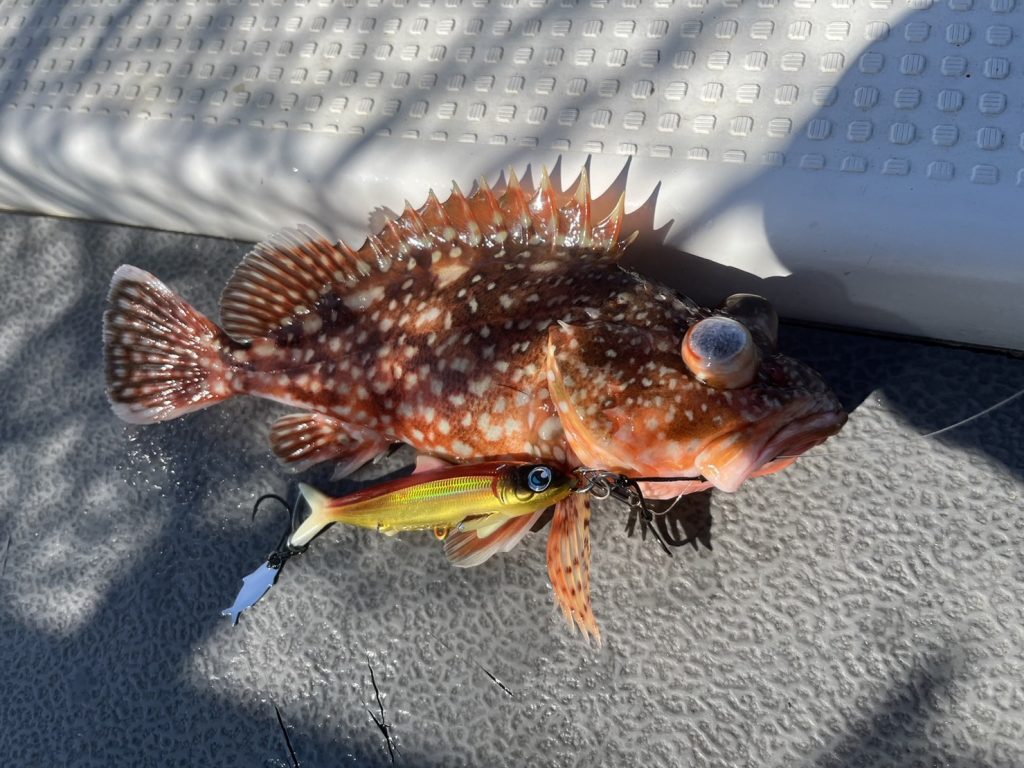久しぶりの出船で張り切って出船しましたが、沖に出るとやはり予報通り多少の風波があったので落ち着くまで近場でメバル狙いでスタートするも、反応はあるものの全くバイトすら無い状態…。