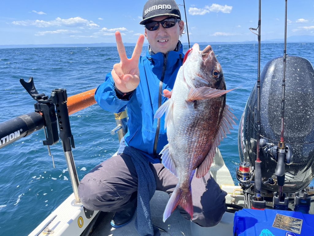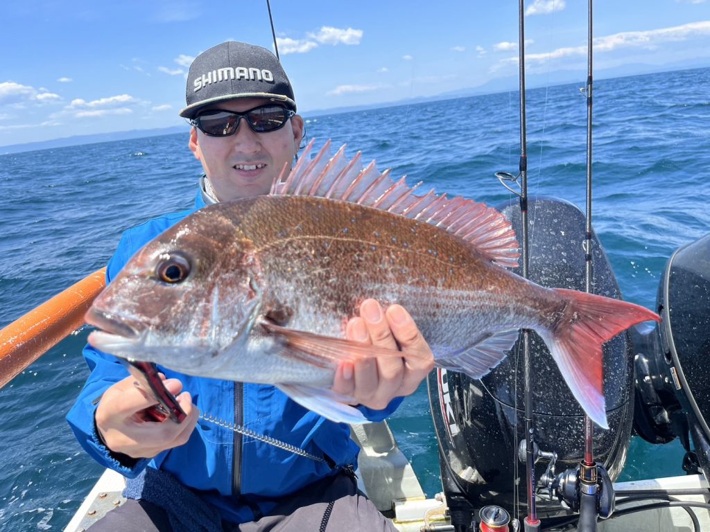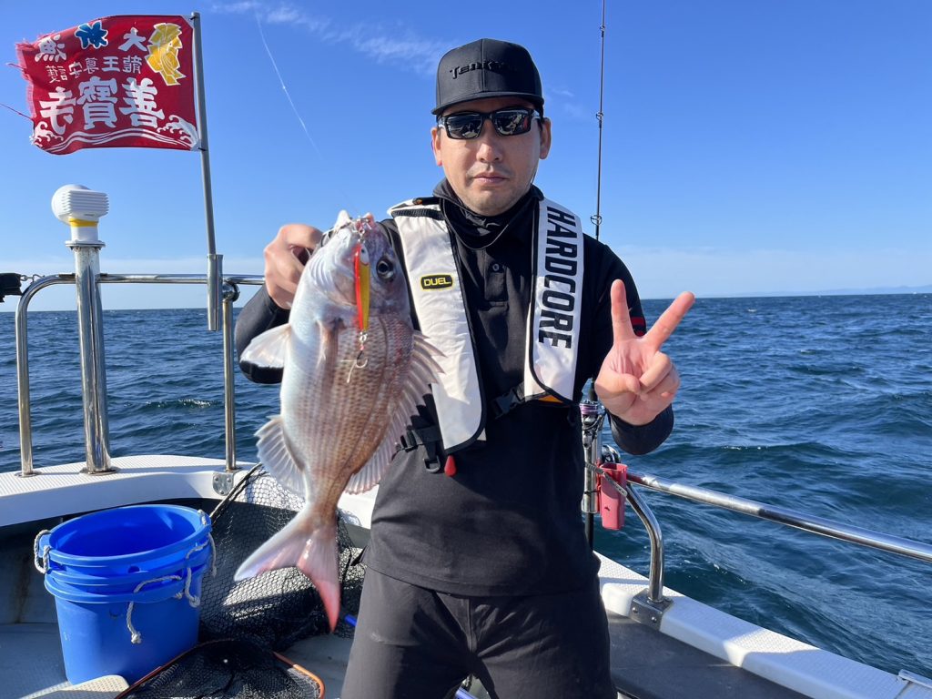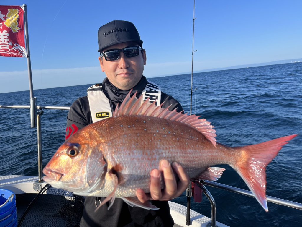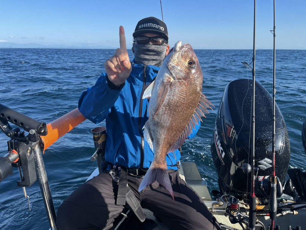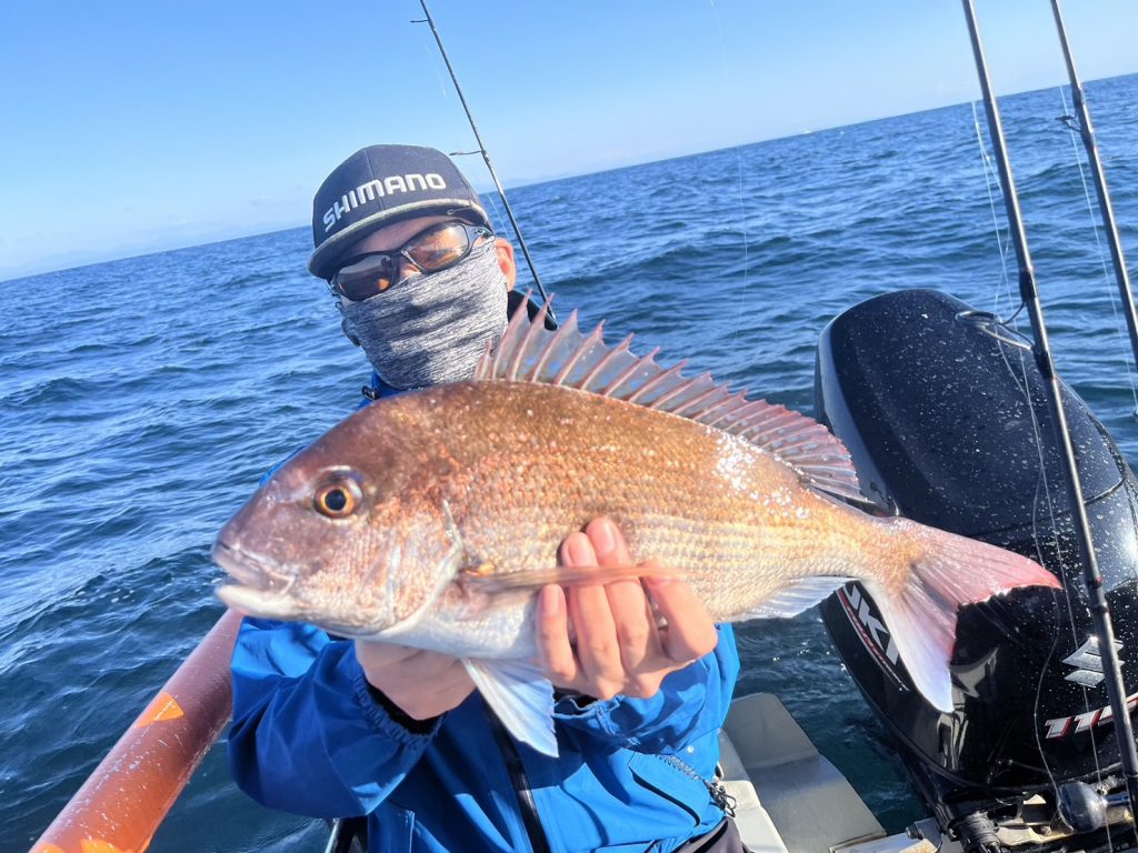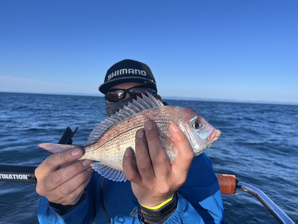 でも午後から風が吹く予報だったので、午前中勝負でポイントに着くと一投目から真鯛の引き!