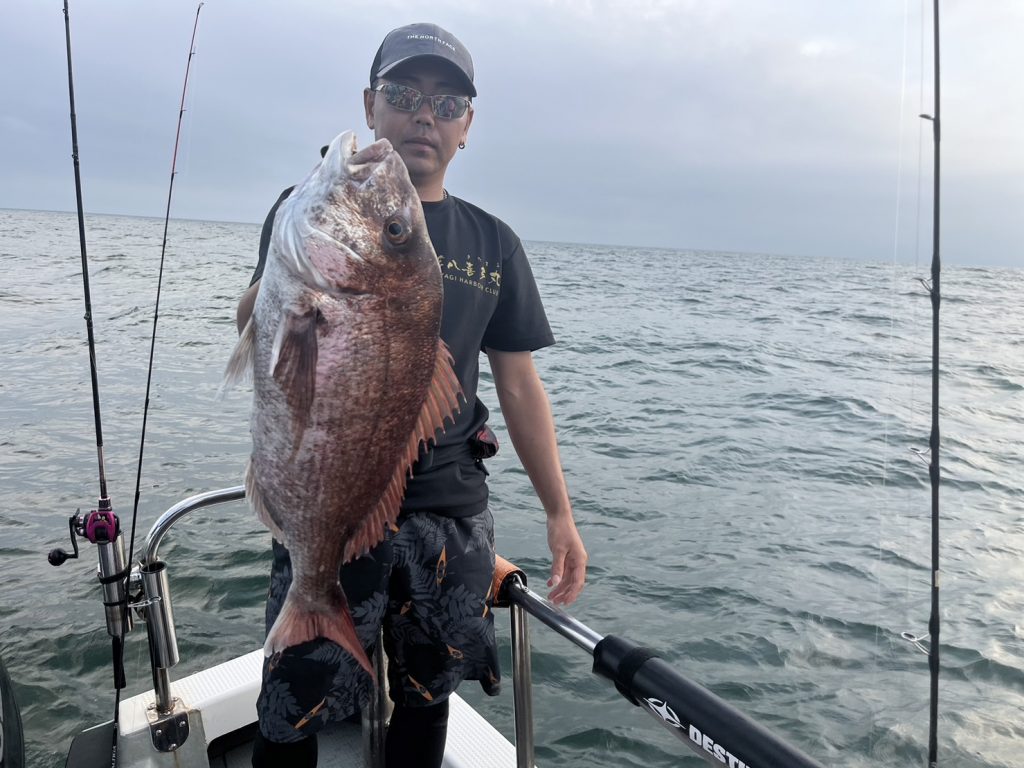 台風明けの荒食いに期待しましたが、濁りのせいか魚探に判断はあるものの中々バイトしてくれず、厳しい時間が続きましたが夕まずめになって、真鯛の顔も見れてプチラッシュ!